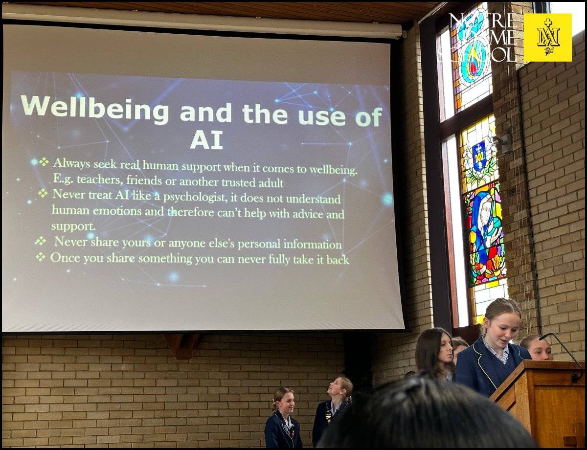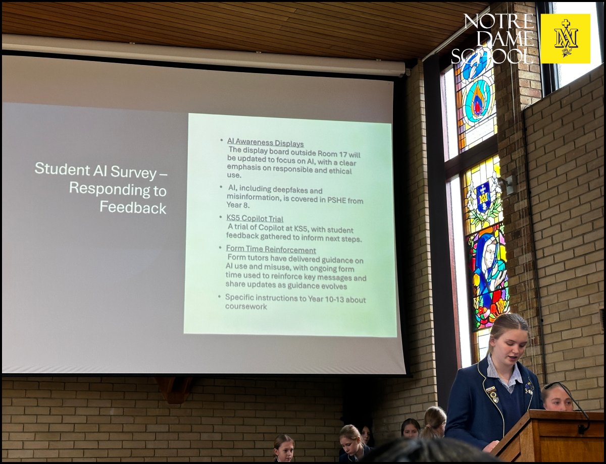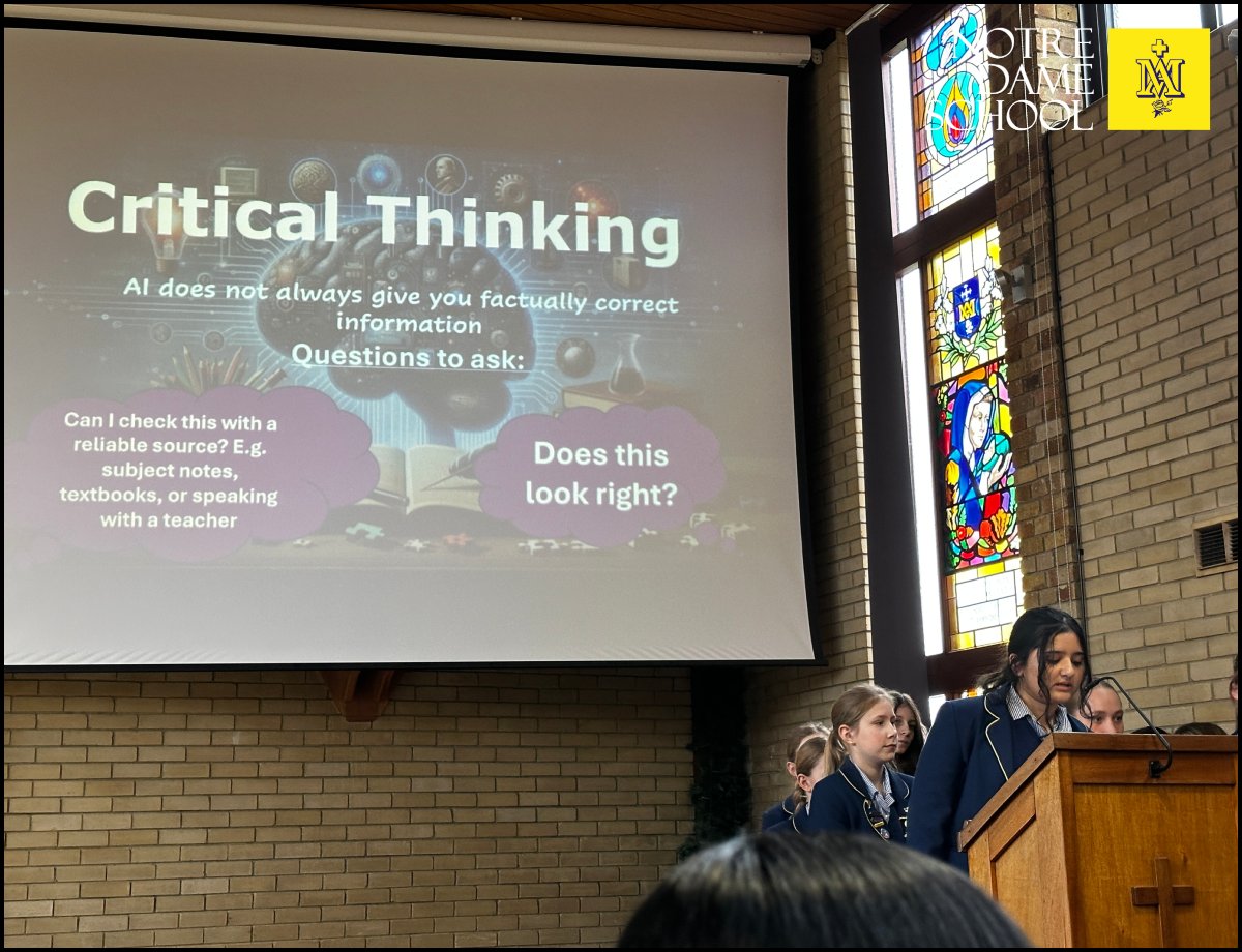 Our Digital Leaders delivered an assembly on responsible AI use, sharing insights from the Year 9–13 student AI survey and highlighting where generative AI can hinder learning, how it can be used as a tool to support learning, concerns around the environment, well-being and the importance of critical thinking when evaluating AI outputs.