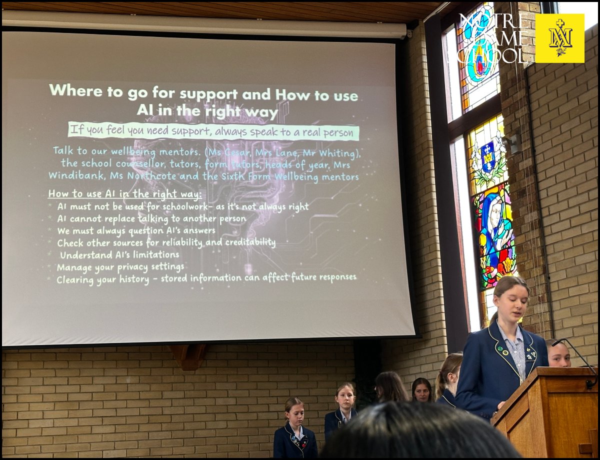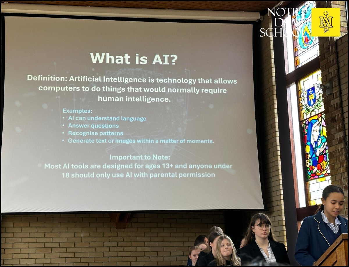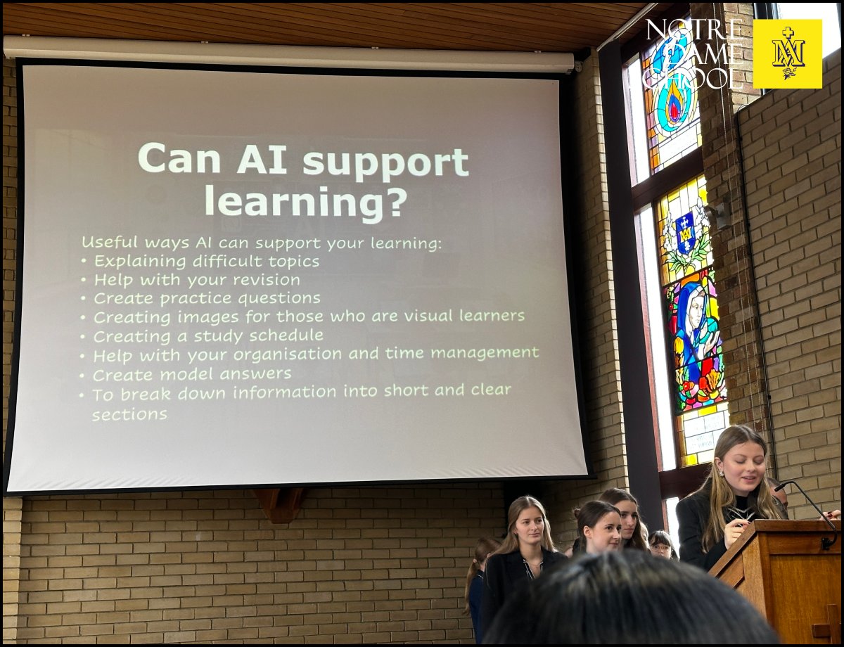 Our Digital Leaders delivered an assembly on responsible AI use, sharing insights from the Year 9–13 student AI survey and highlighting where generative AI can hinder learning, how it can be used as a tool to support learning, concerns around the environment, well-being and the importance of critical thinking when evaluating AI outputs.
