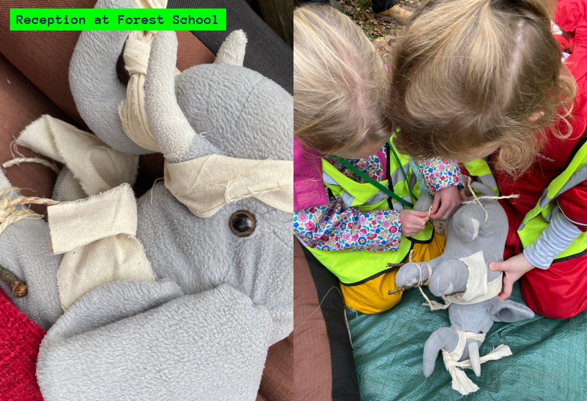 Reception class worked as a team in Forest School practicing advanced First Aid techniques with the toy animals making tourniquets for catastrophic bleeds and making splints for broken limbs.