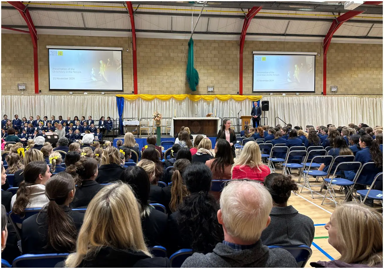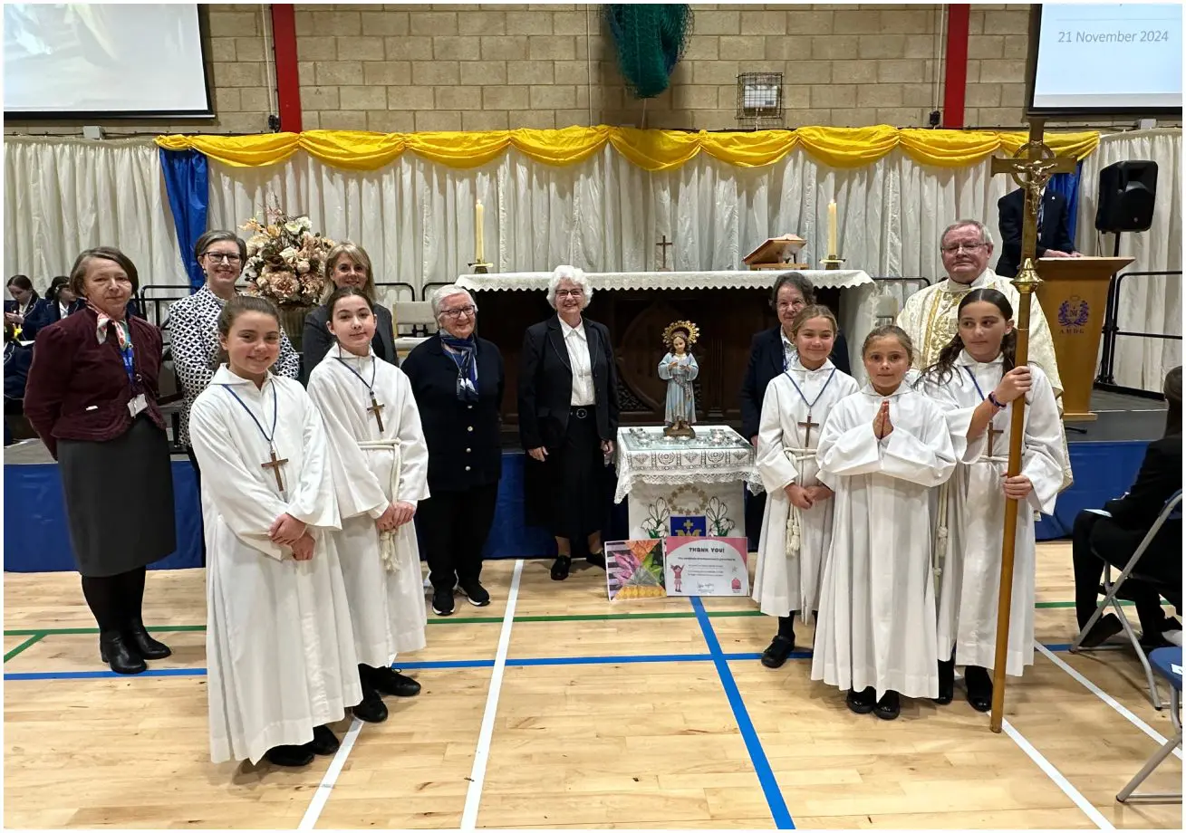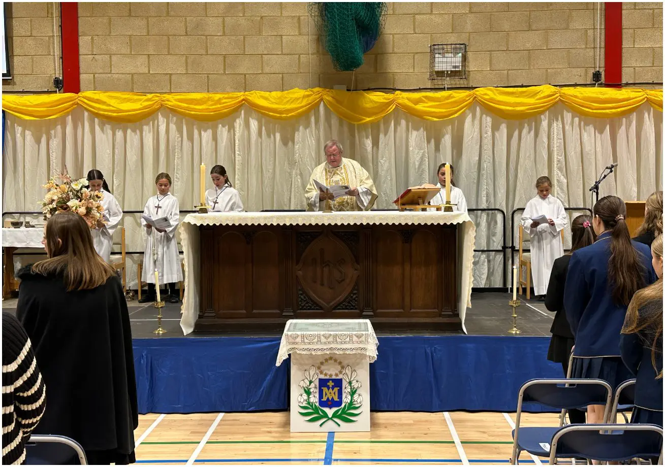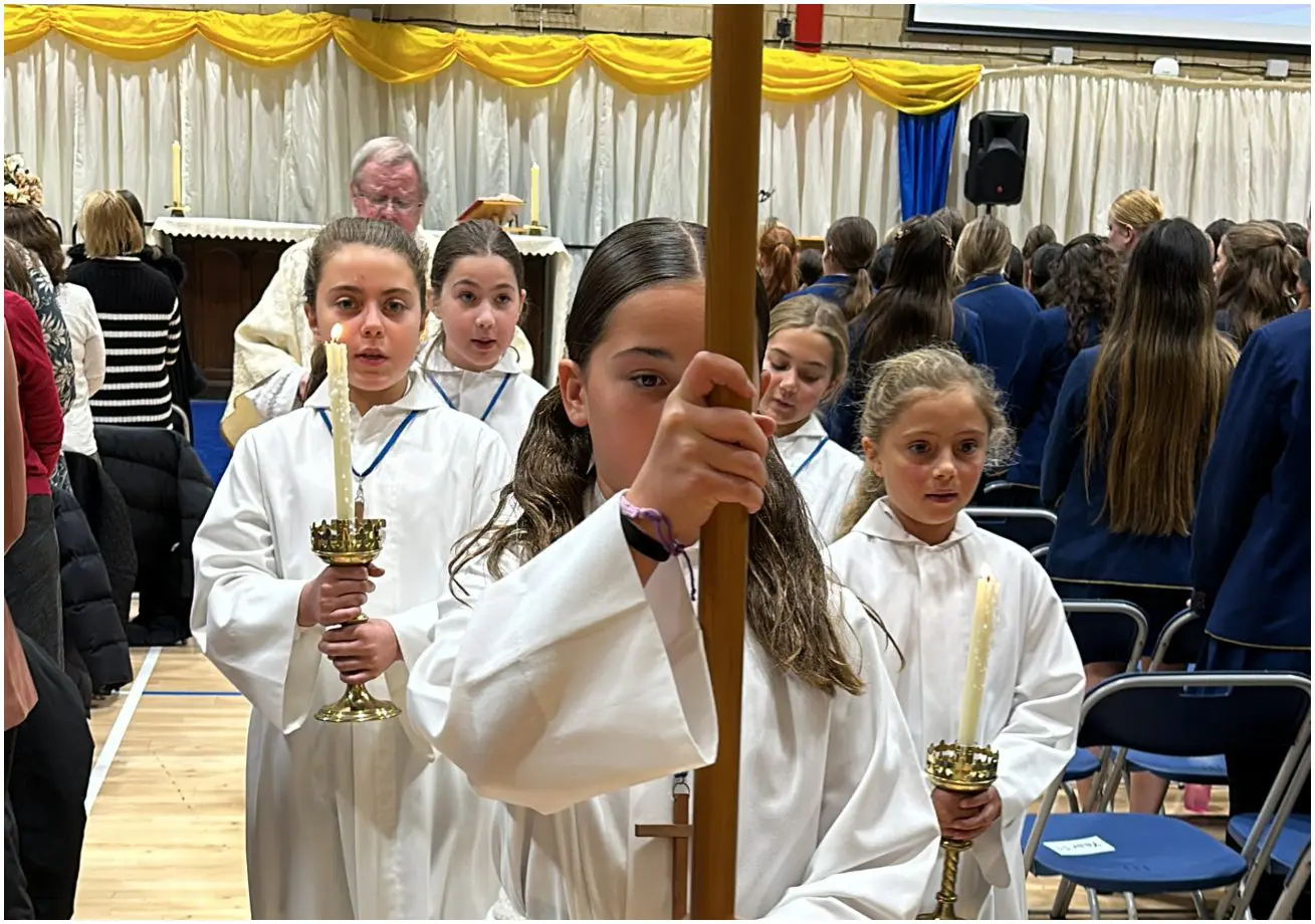 The feast day was marked with a special Mass for the whole school. The Mass was memorable for the fact that all pupils and students from Reception to Year 13 were together in the Sports Hall, and for the beautiful music which was the combined work of Prep, Senior and Staff musicians and choirs. We maintained the tradition of more than 400 years in carrying forwards a statue of the child Mary in procession, followed by candles representing each of the year groups in the school. We presented tokens of our work, and of the charitable endeavours of the school.