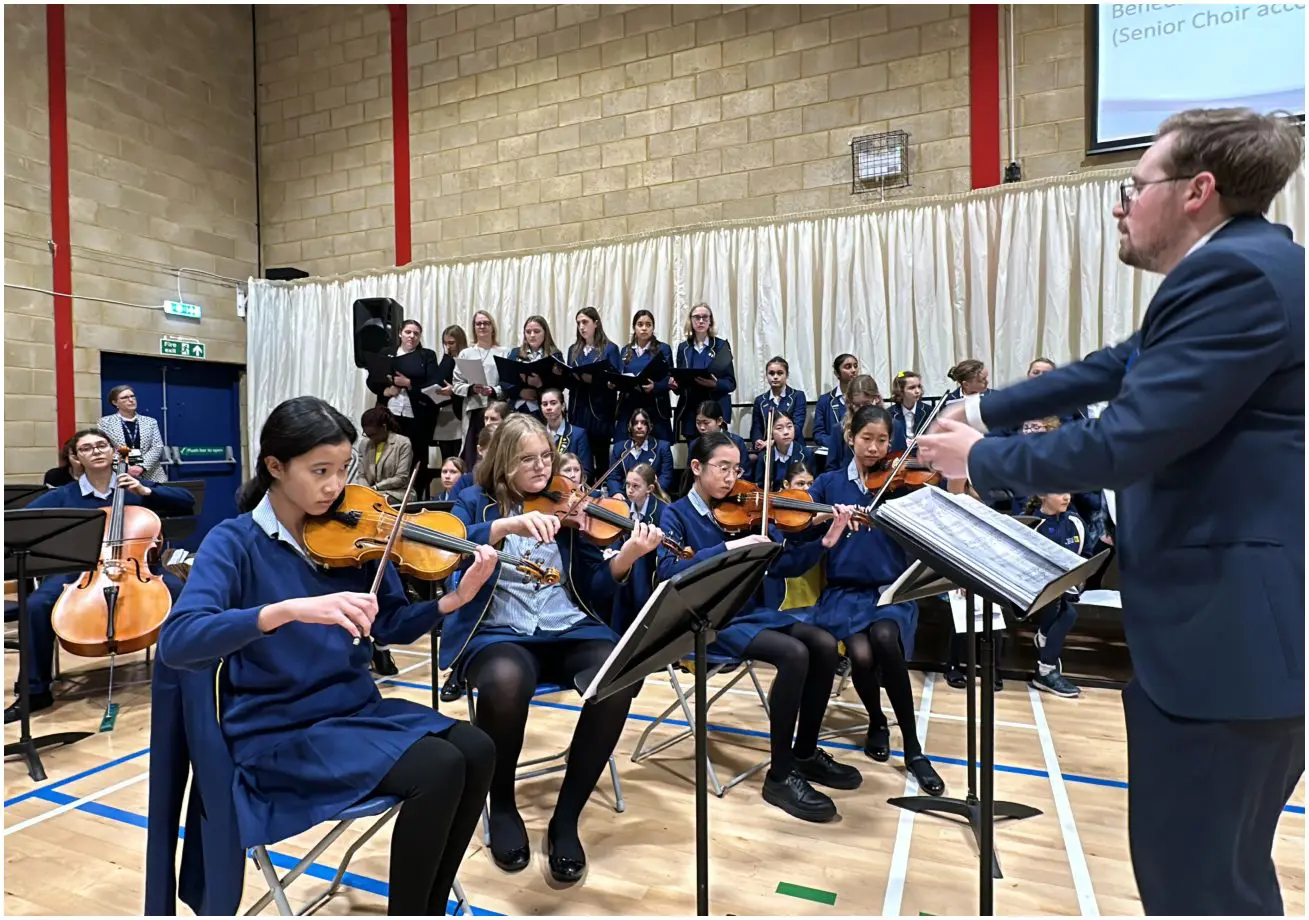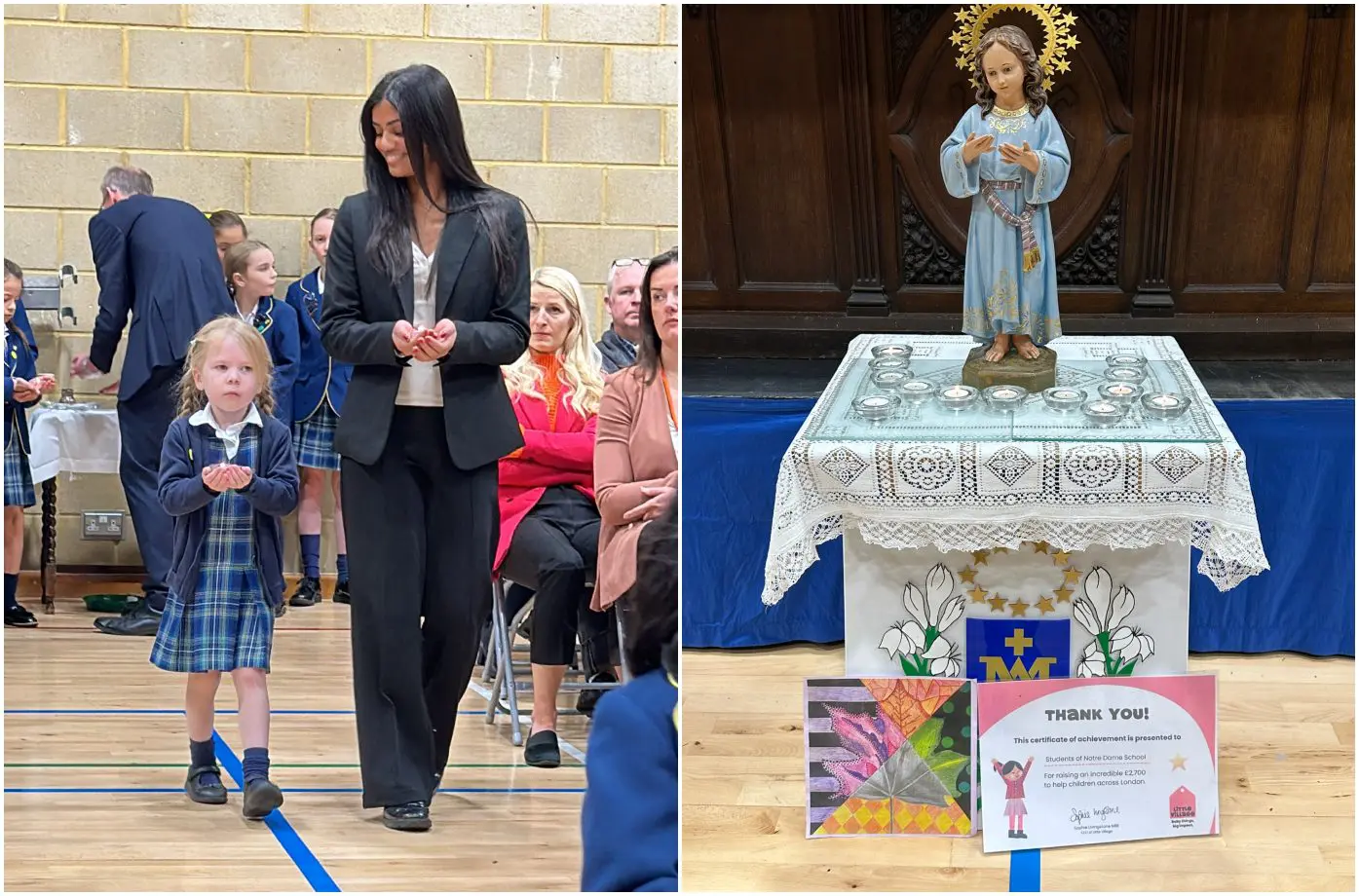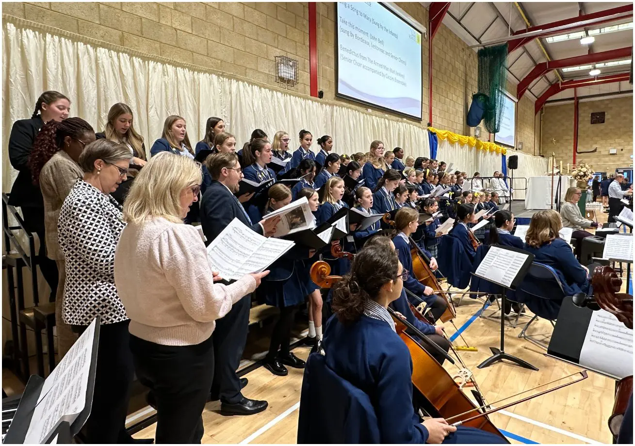 The feast day was marked with a special Mass for the whole school. The Mass was memorable for the fact that all pupils and students from Reception to Year 13 were together in the Sports Hall, and for the beautiful music which was the combined work of Prep, Senior and Staff musicians and choirs. We maintained the tradition of more than 400 years in carrying forwards a statue of the child Mary in procession, followed by candles representing each of the year groups in the school. We presented tokens of our work, and of the charitable endeavours of the school.