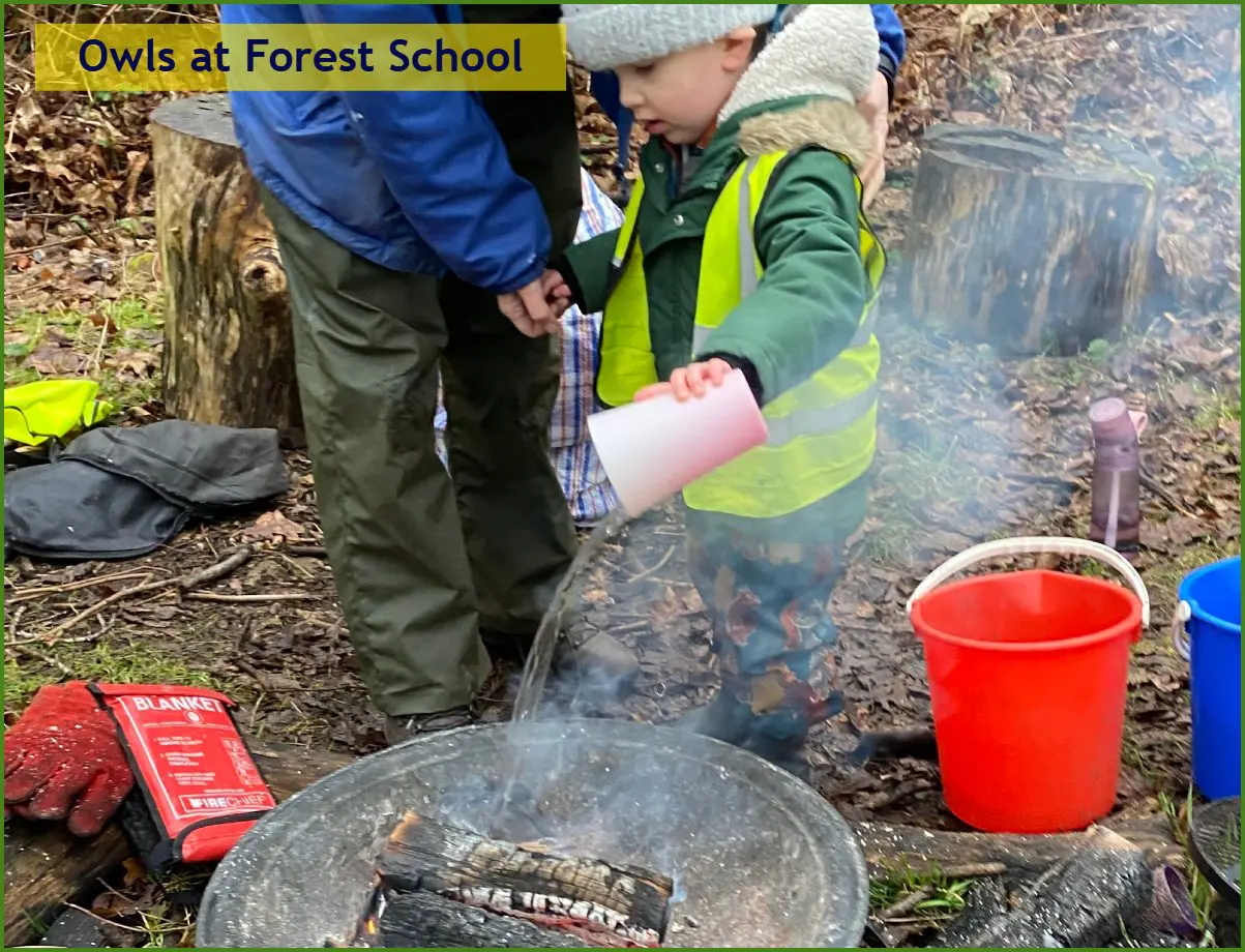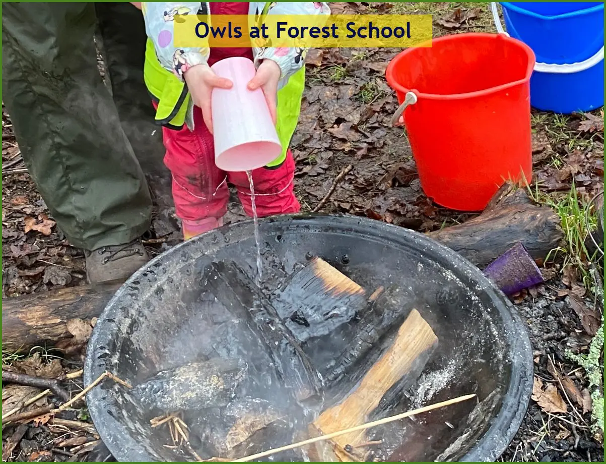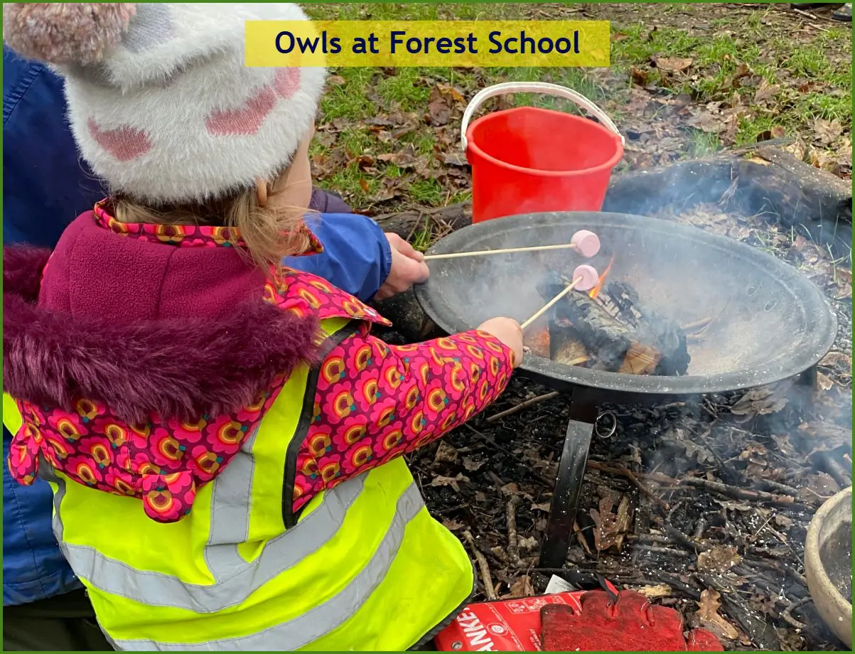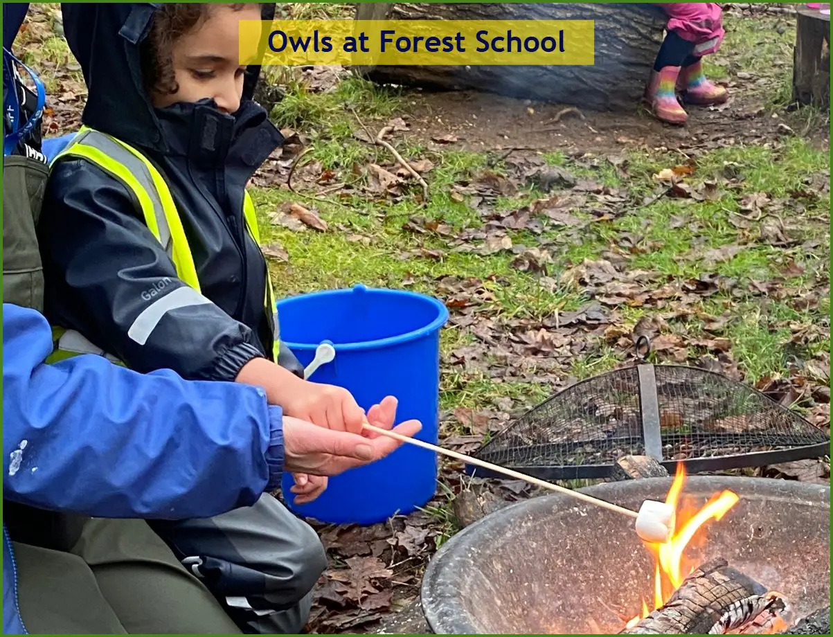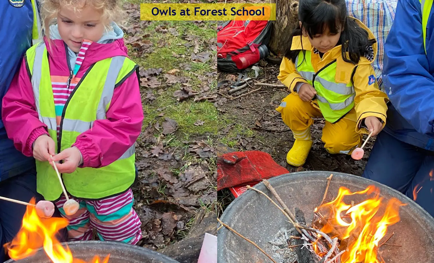 The Wise Owl groups did so well this week remembering the Forest School rules in keeping safe around fire. They cooked marshmallows with safe kneeling and enjoyed putting out the fire with water remembering to walk on the outside of the fire circle. Well done!