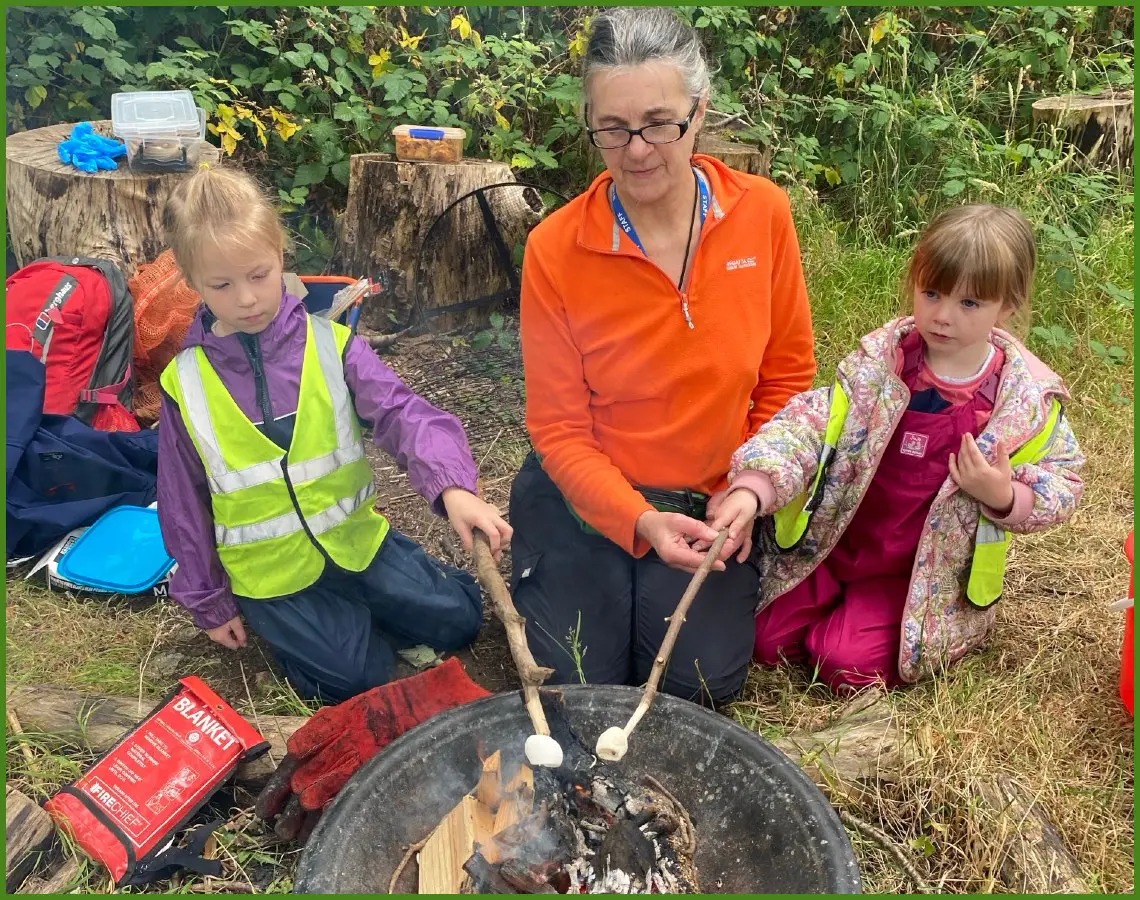 Session 1:Â Wise Owls whittling a stick to hold a marshmallow to roast over the campfire, practicing fire lighting with a fire steel striker and enjoying the marshmallows around the campfire. #campfirecooking #beginningwithbasics #precisionandcontrol #woodlanddiscoveries #beetles #fsa