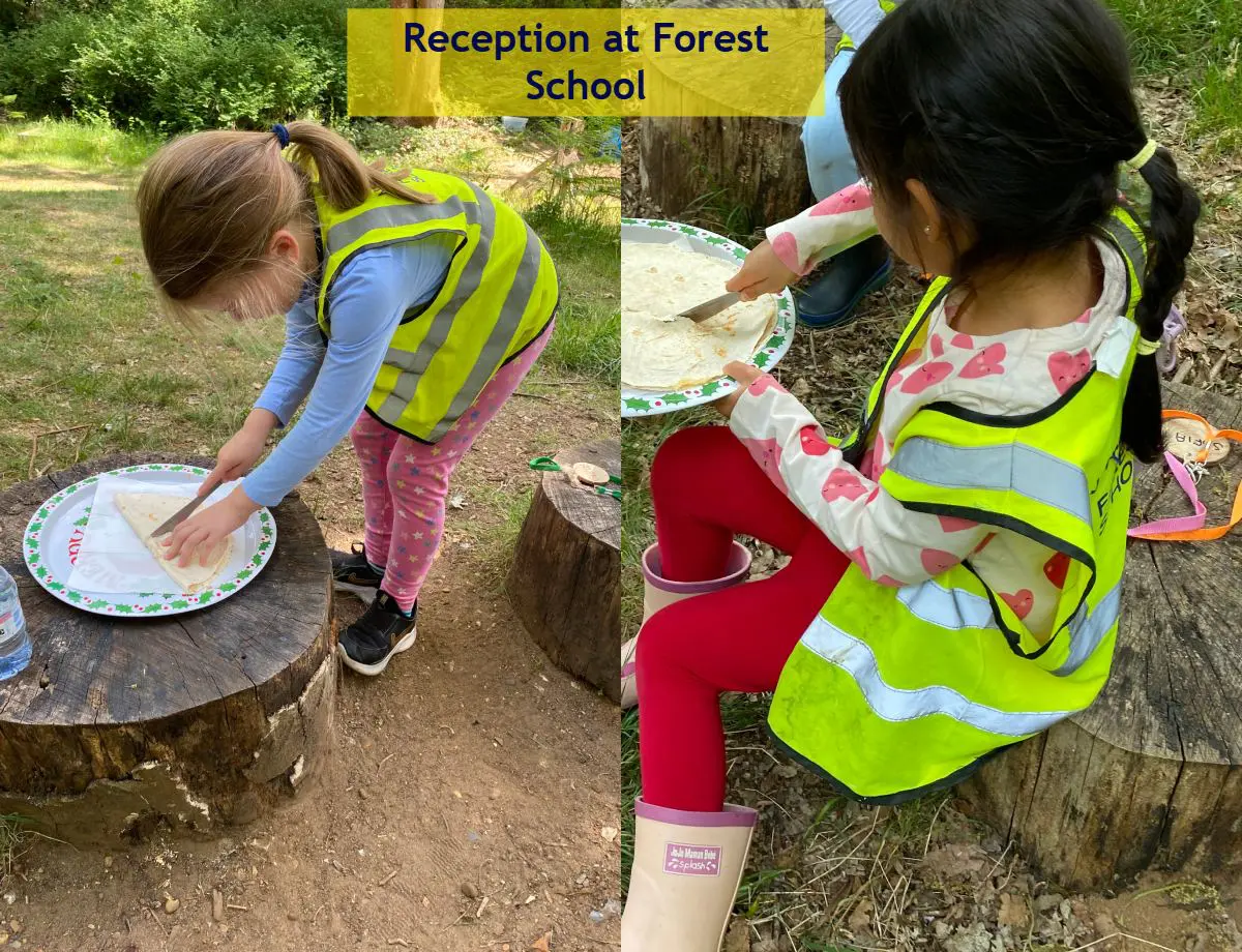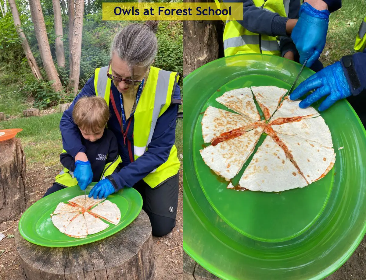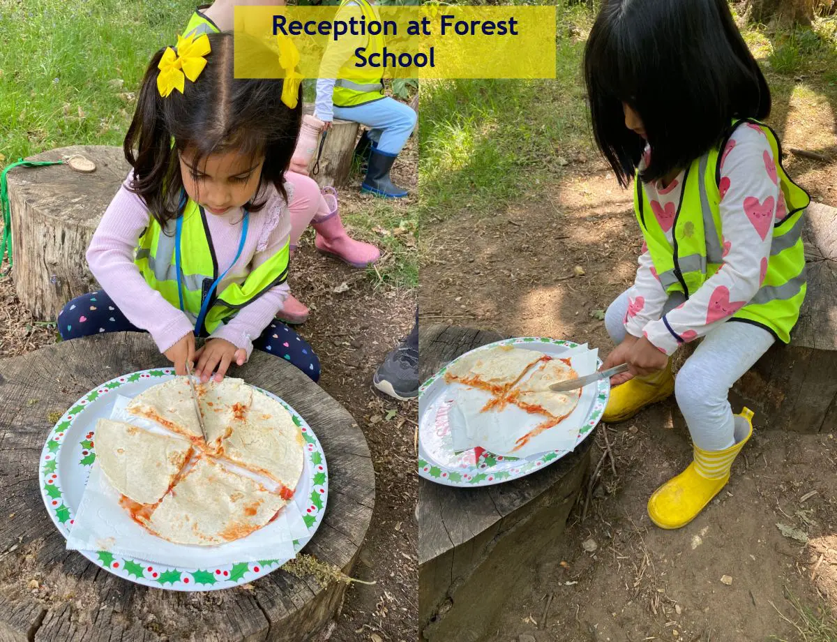 Reception girls practising problem solving with aspects of division doing their best to cut equal sized pieces of quesadillas to share with class mates and then enjoyed eating together around the fire circle.