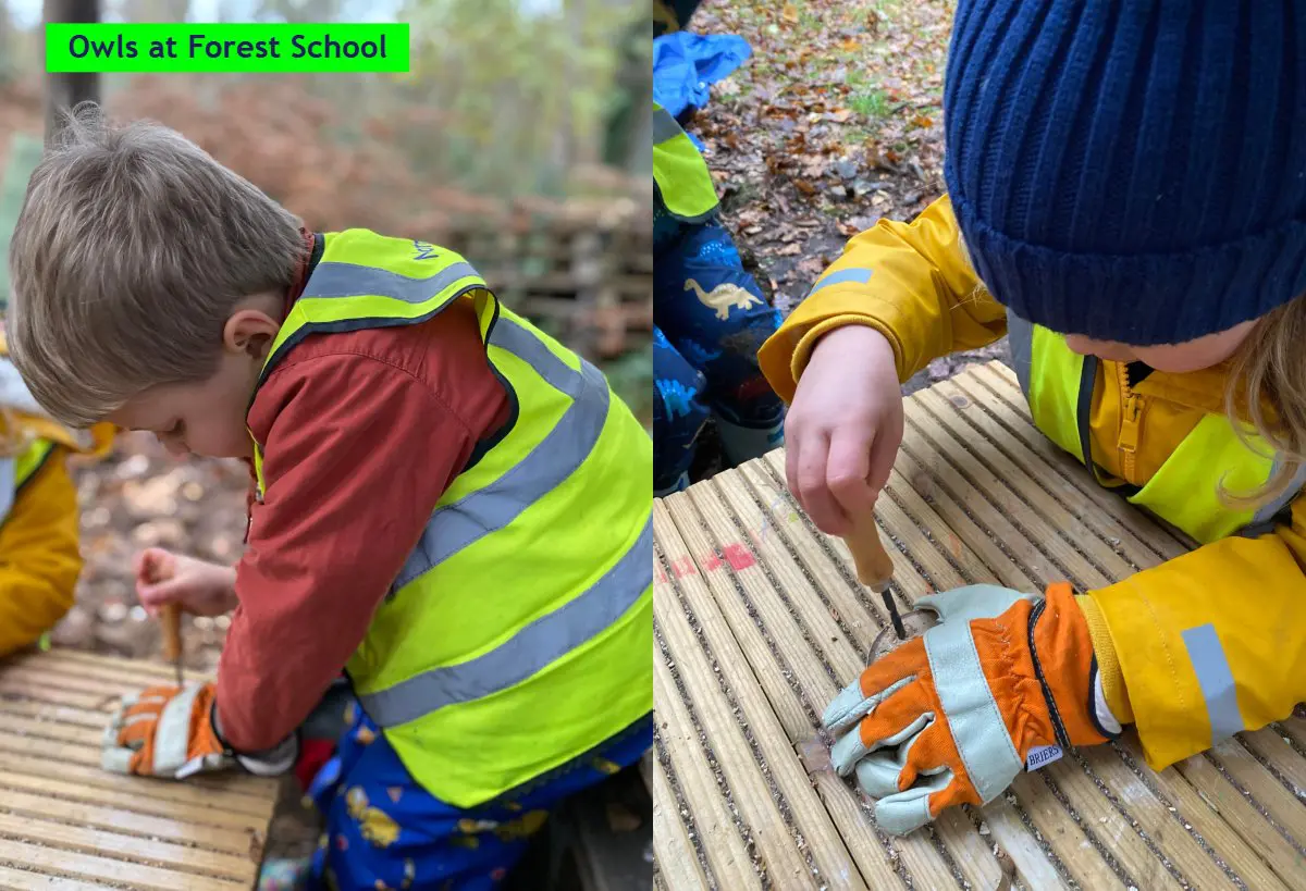 Our Wise Owls groups have been busy practising their outdoor skills: sawing, drilling and even splashing in puddles! It’s all part of the fun and learning at Forest School, where hands-on experiences help build confidence and creativity.