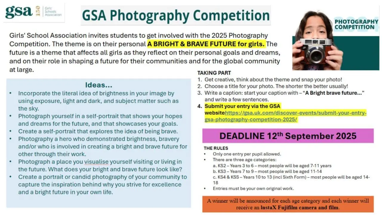 You have until the 12th of September to enter and this can be done via the GSA website. GSA Photography Competition 2025 – Girls’ Schools Association.