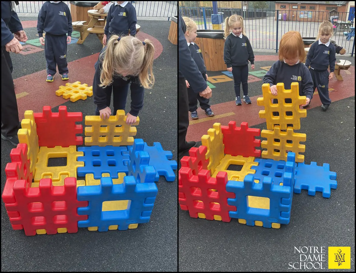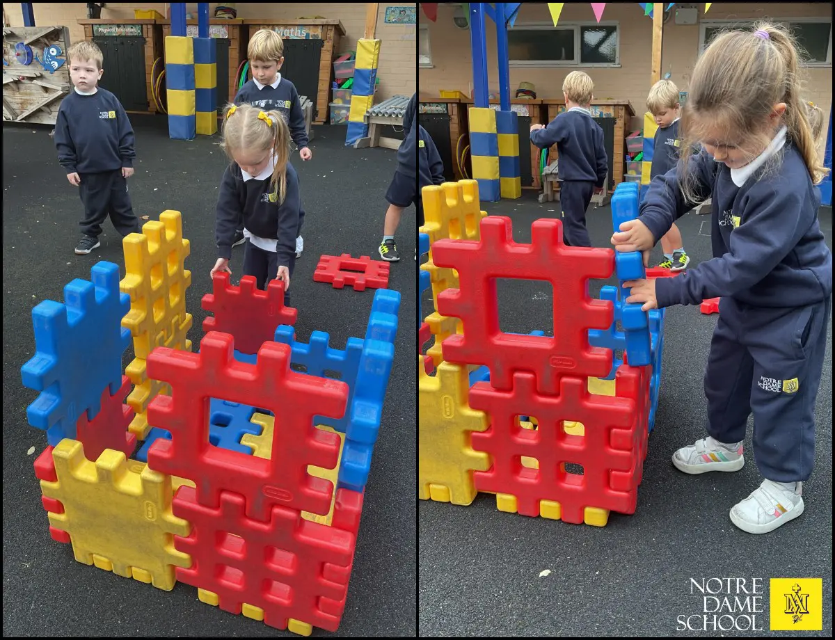 This week, the Owls have been exploring shapes through imaginative play and storytelling. Inspired by the book Whatever Next, the children worked together to build a rocket using large construction blocks, ready to send our very own Notre Dame bear to the moon, just like Baby Bear in the story!