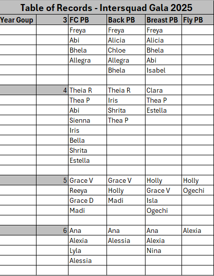 CLICK HERE to see a table showing who has set new records and in what stroke. All these new records are so impressive, and this is one of the reasons we hold this event each year because the girls consistently produce their best times at this event. Girls if you would like to know your times please let me have your planners and I will update them.