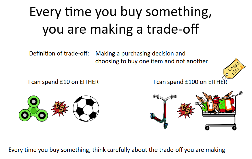 We ended our session learning about “TRADE OFFS”. When someone buys something, they are making a choice – a trade-off – whereby they decide to buy one thing and