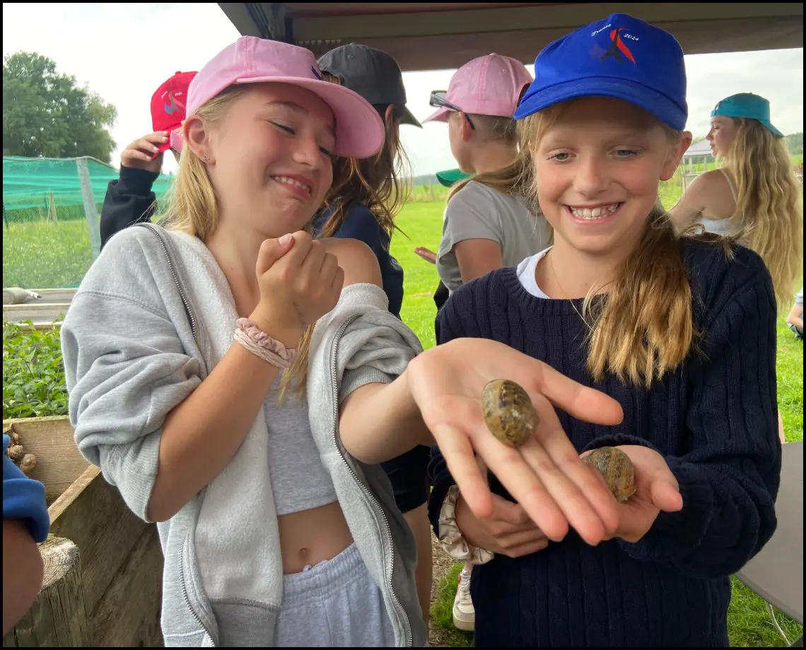 When we arrived to the snail farm, we entered the snail nursery where there was snails a graveyard where all the old shells were! Then we were able to hold the snails, some of them came out of their shells and others didn’t – they were very slimy! Later we we learned what part of the snails were in French and how they were reared.