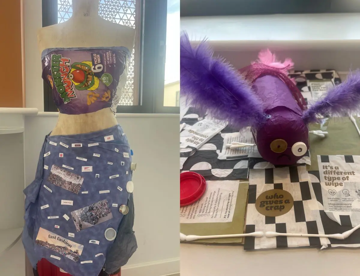 They had to work in small groups and create a piece of art using recycled materials and an accompanying information poster about their exhibit. The purpose of the project was to repurpose waste materials and highlight an environmental issue including carbon footprints, plastic pollution and fast fashion.