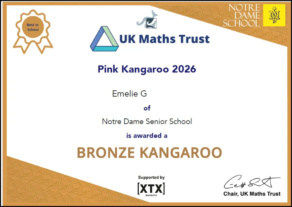 We are delighted to announce that Emelie G, a Year 11 student, achieved a Bronze Award in the UKMT Pink Kangaroo Challenge.