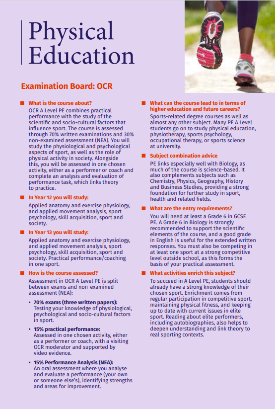 PE links especially well with Biology, as much of the course is science-based. It also complements subjects such as Chemistry, Physics, Geography, History and Business Studies, providing a strong foundation for further study in sport, health and related fields.