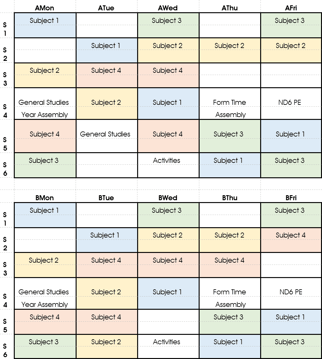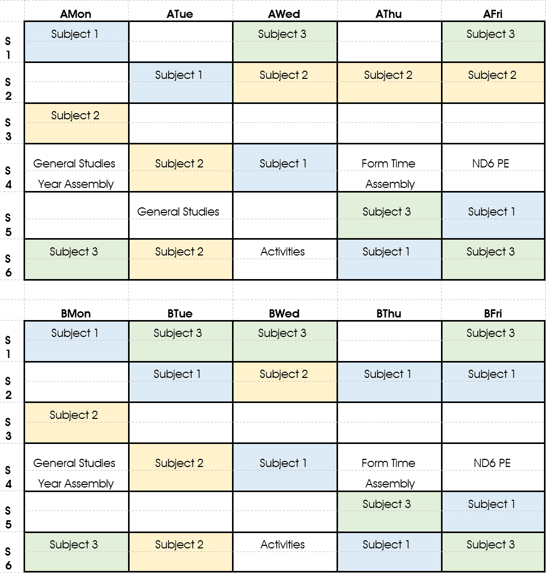 The Sixth Form timetable comprises of subject lessons, Sixth Form General Studies, Sixth Form PE and Activities. The remainder of the week is used for private study.